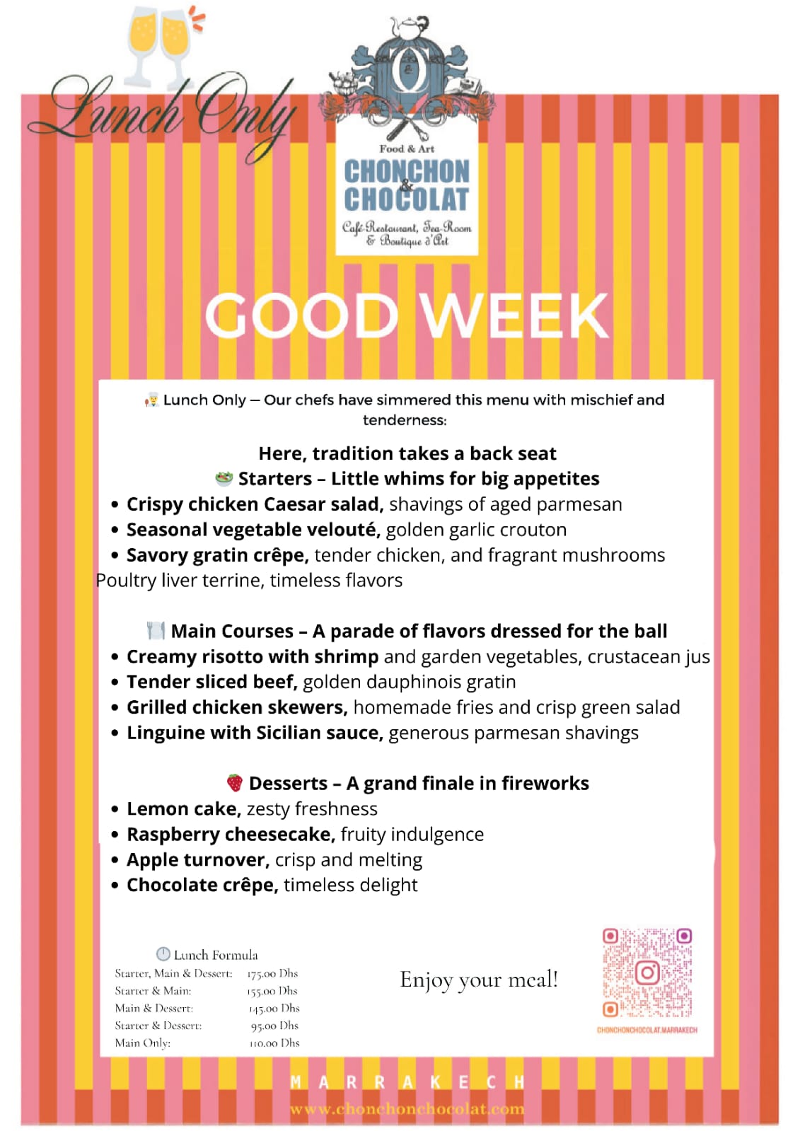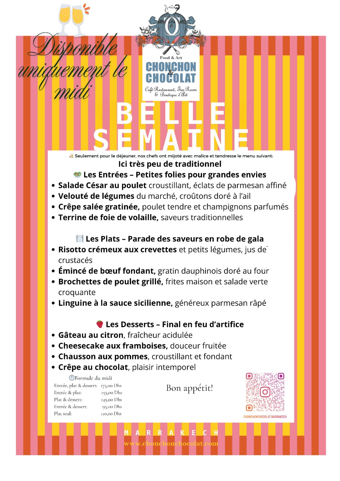 Chez CHONCHON & CHOCOLAT, le brunch n’est pas qu’un repas, avec des viennoiseries et des mets sucrés et salés, c’est une déclaration d’amour au matin. Voici quelques vers inspirés du menu que tu pourrais entendre fredonner dans l’air : quand le matin rime avec festin, et que le pain croustillant fait danser le thym, le jus d’orange s’éclaire comme un refrain, et le chocolat murmure : “Reviens demain…”